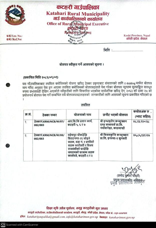 बोलपत्र स्वीकृत गर्ने आसयको सूचना ।