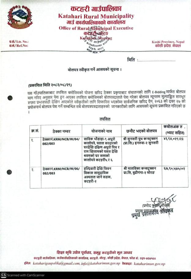 बोलपत्र स्वीकृत गर्ने आसयको सूचना ।