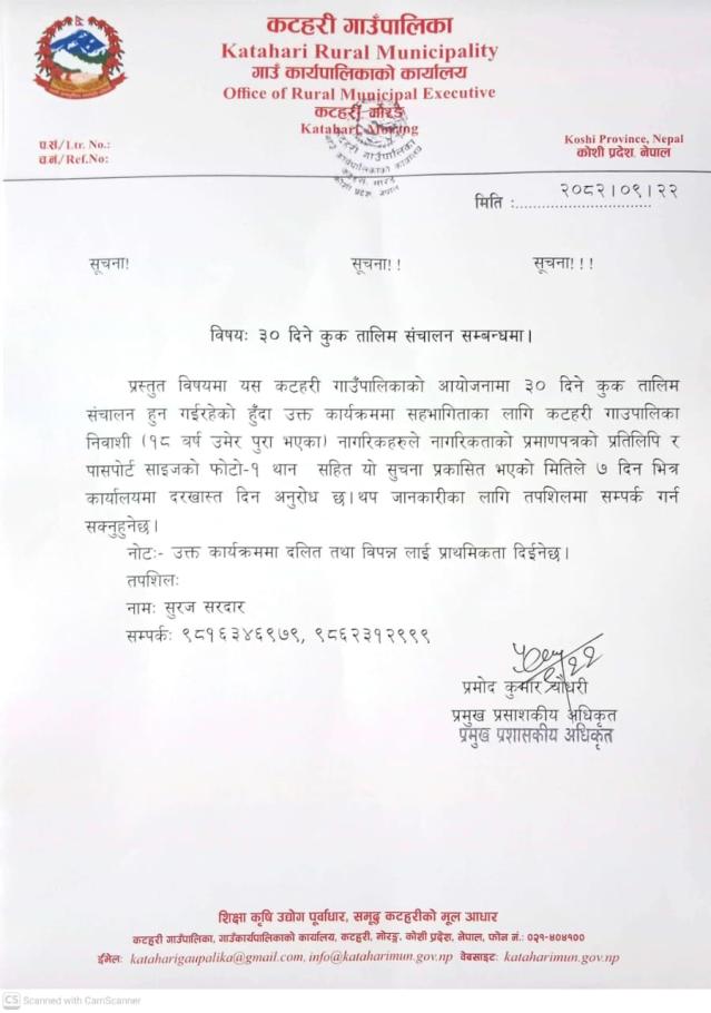 कुक तालिम संचालन सम्बन्धमा सूचना ।