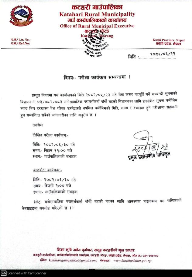 मनोसमाजिक परामर्शकर्ता सहायक पाचौँ (विज्ञापन नं.३/०८२/०८३) पदको परिक्षा तालिका प्रकाशन गरिएको सूचना