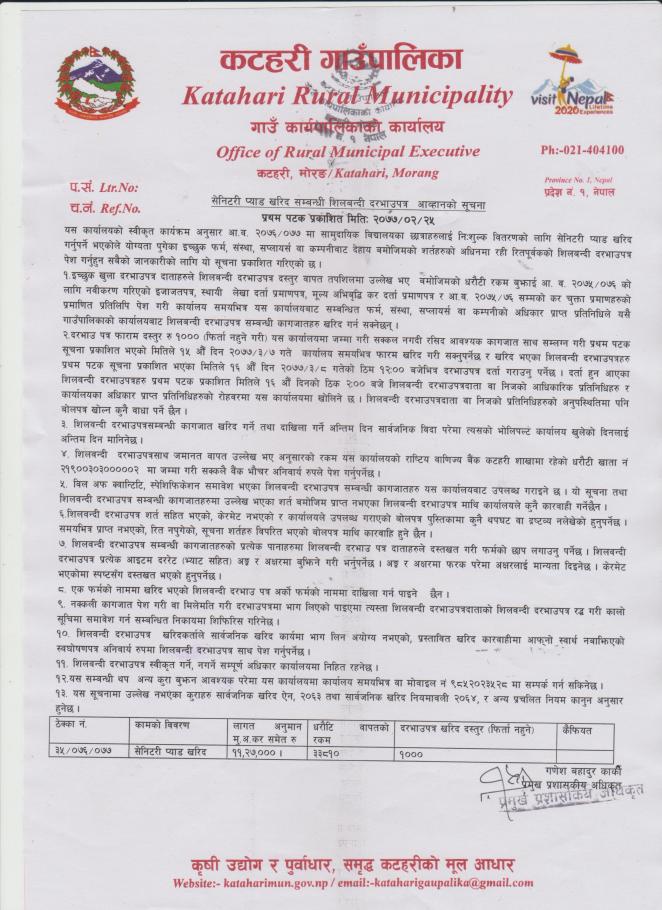 शिलबन्दी बोलपत्र आव्हानको सूचना (ठिक्का नं ३५/०७६-०७७ - सेनिटरी प्याड खरिद )