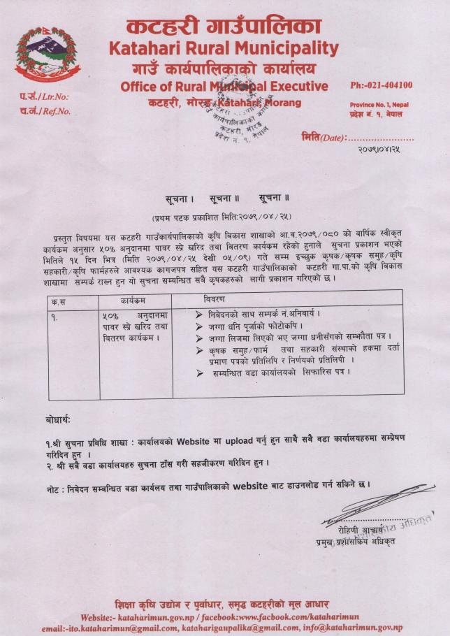 ५०% अनुदानमा पावर स्प्रे खरिद तथा वितरण सम्बन्धी सूचना !!!